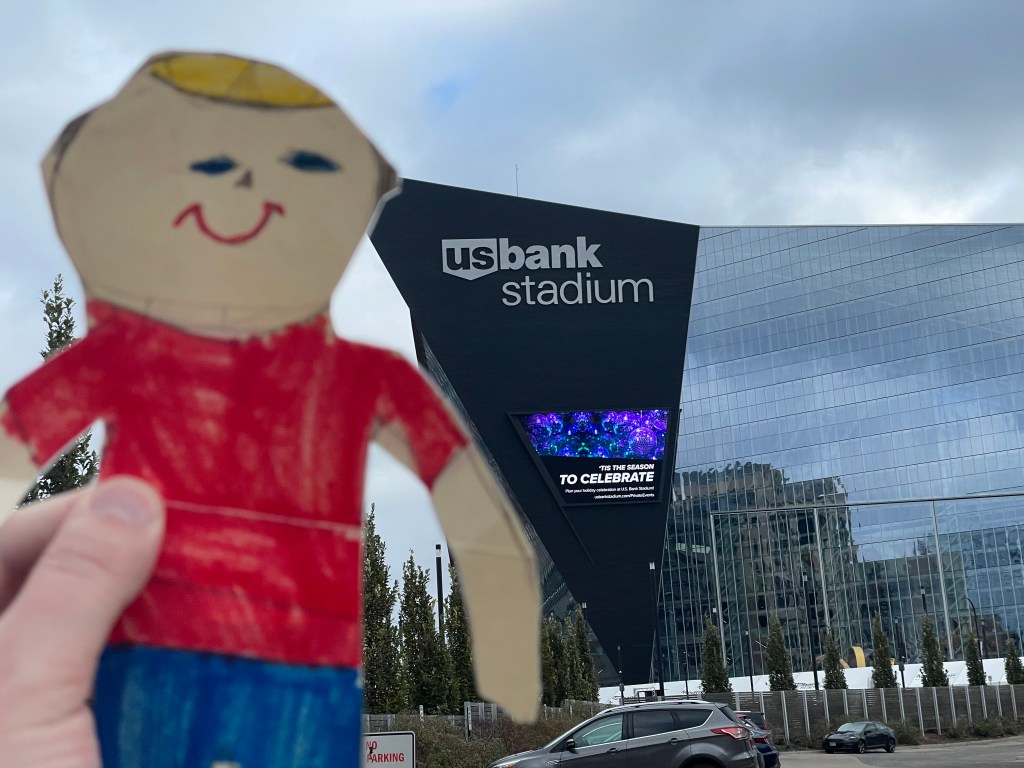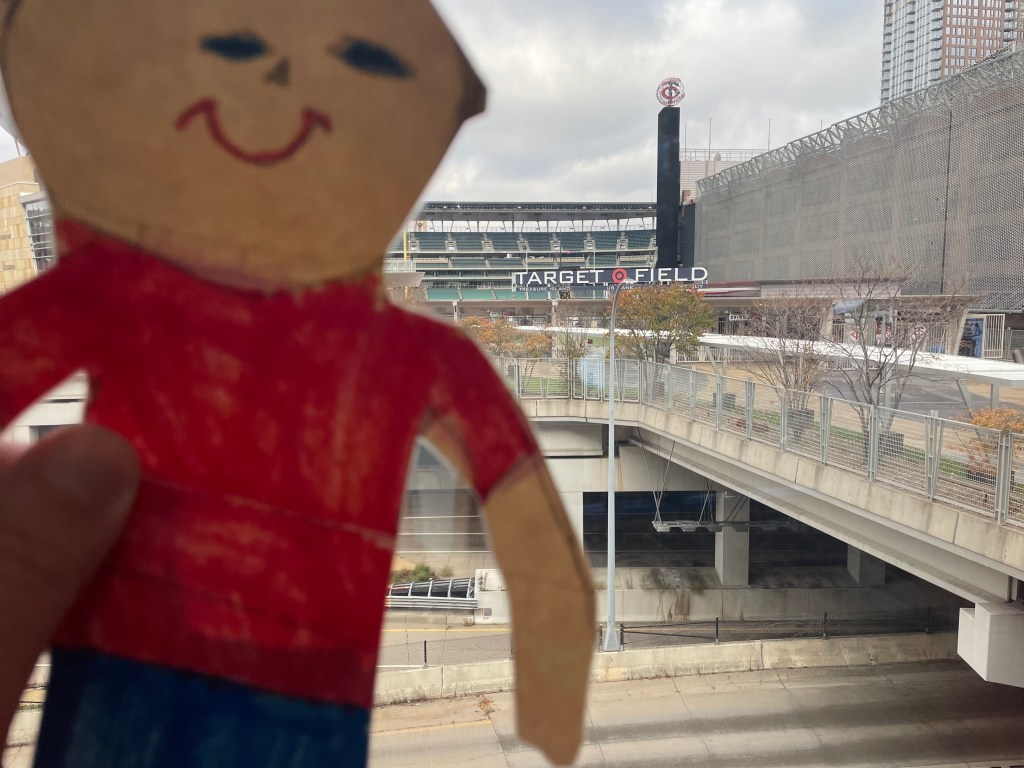 Hello! Flat Tyler here! I’m having so much fun with Tyler’s aunt and uncle here in Minneapolis, MN! They even let me go downtown with their neighbor, Carl. I got to see the U S Bank Stadium, where the MInnesota Vikings play and Target Field, where the MInnesota Twins play. Did you know that Minneapolis is home to Target Headquarters?