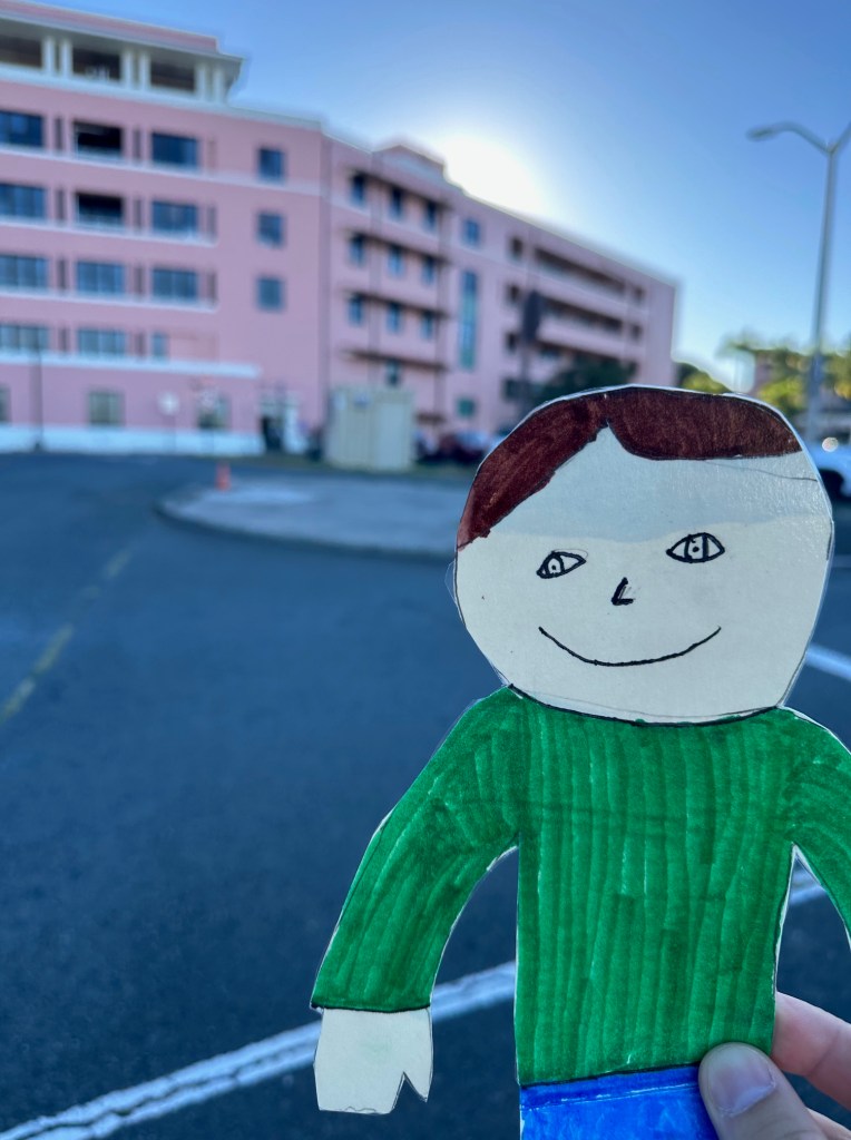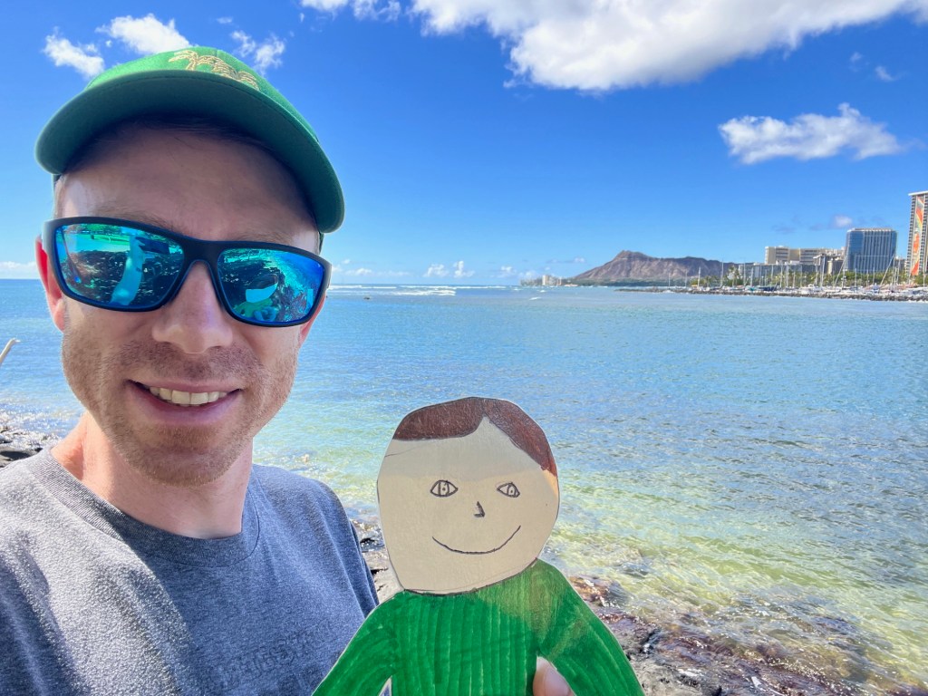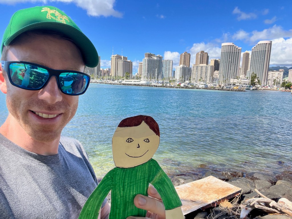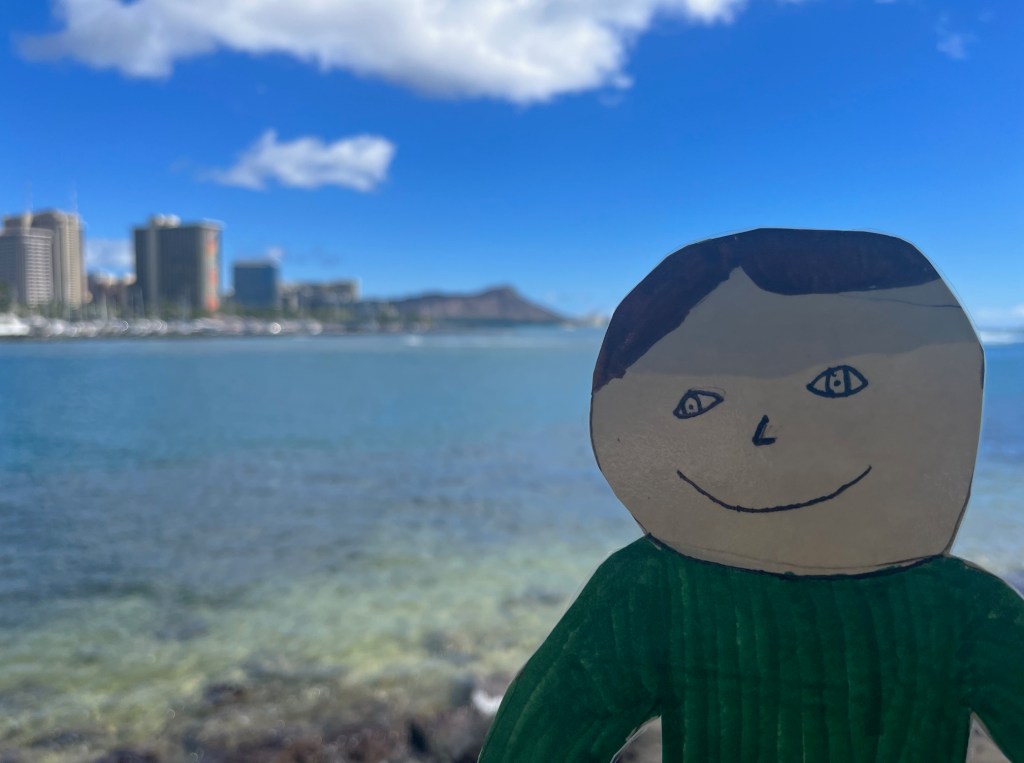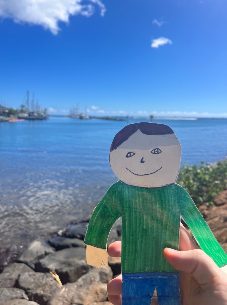 Flat Liam made it to Honolulu, Hawaii! It is bright and sunny here and the temperature is always in the high 80s. The airport is right next to the beautiful ocean!