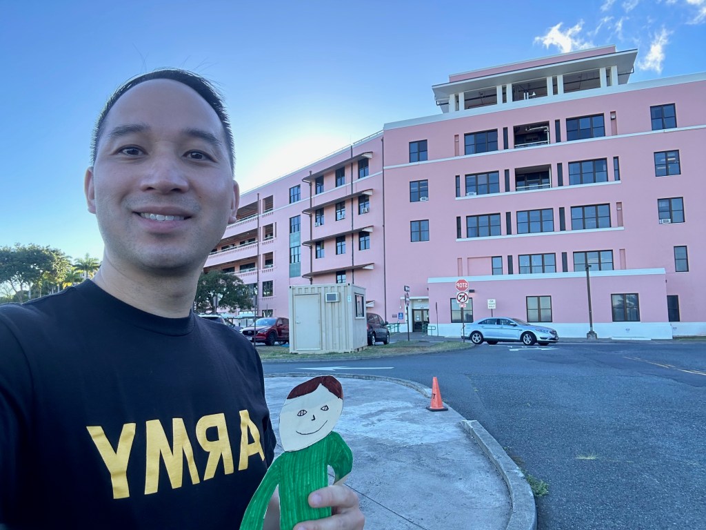 Today I went to work with Loc. He works at the famous pink hospital on the hill called Tripler Army Medical Center. You can see it from the airport.