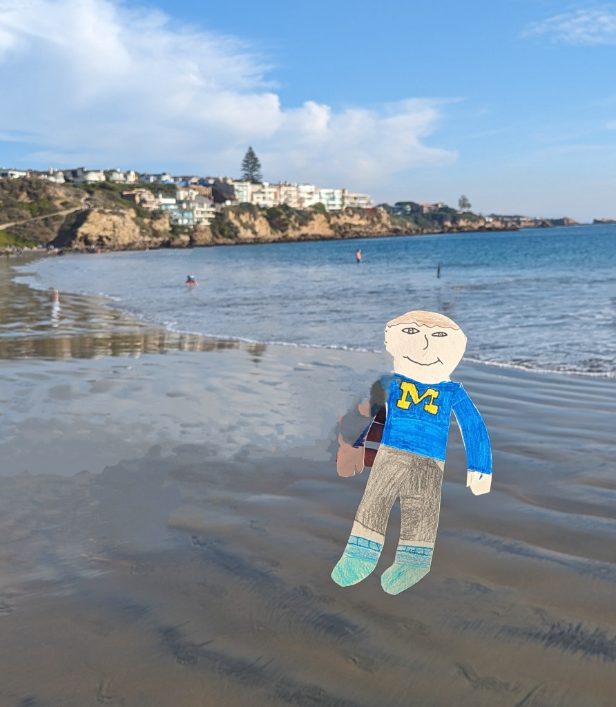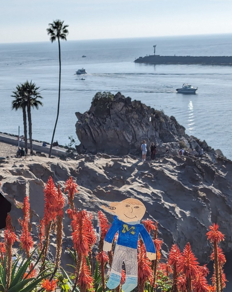 Flat Spencer spent part of the day at the beach in Corona Del Mar California. It was a beautiful 75 degree day. Here he is walking on the beach and at the overlook looking out at the entrance to Newport Harbor where the boats sail out into the Pacific Ocean for fishing, whale watching, or just enjoying the water. Spencer is having a great time so far.