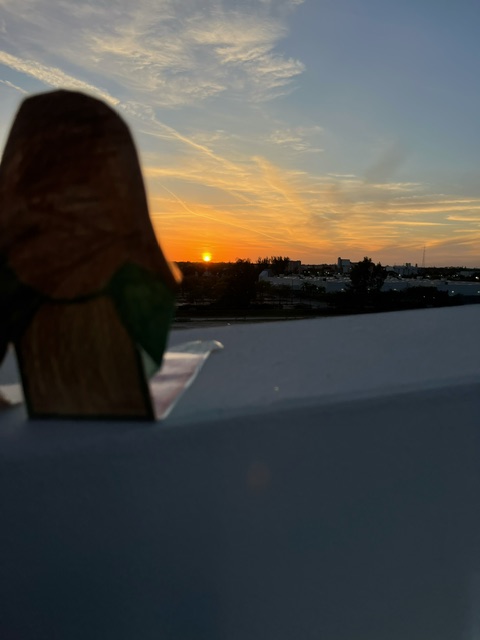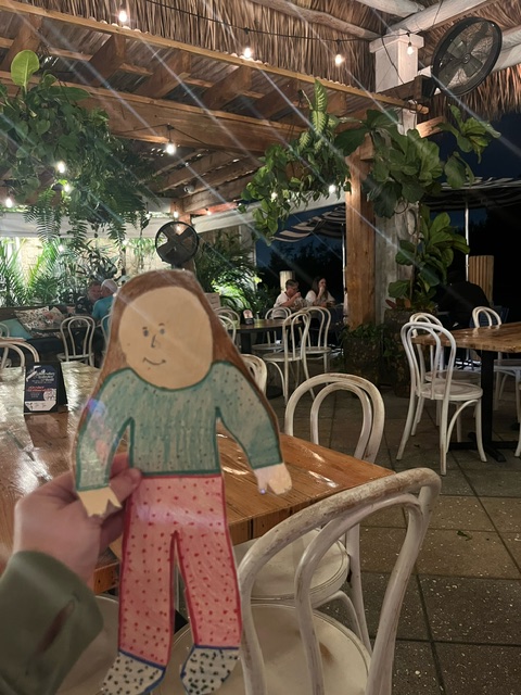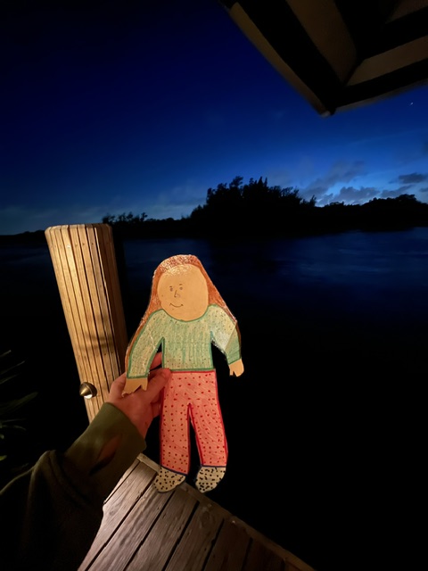 Flat Aubrey and I went to dinner tonight at a restaurant called “Tiki Tiki” in Hollywood, FL. We got to eat some seafood and brussel sprouts as we watched big boats coast by our dinner table. She had so much fun and asked for lots of pictures to send to you and the class.