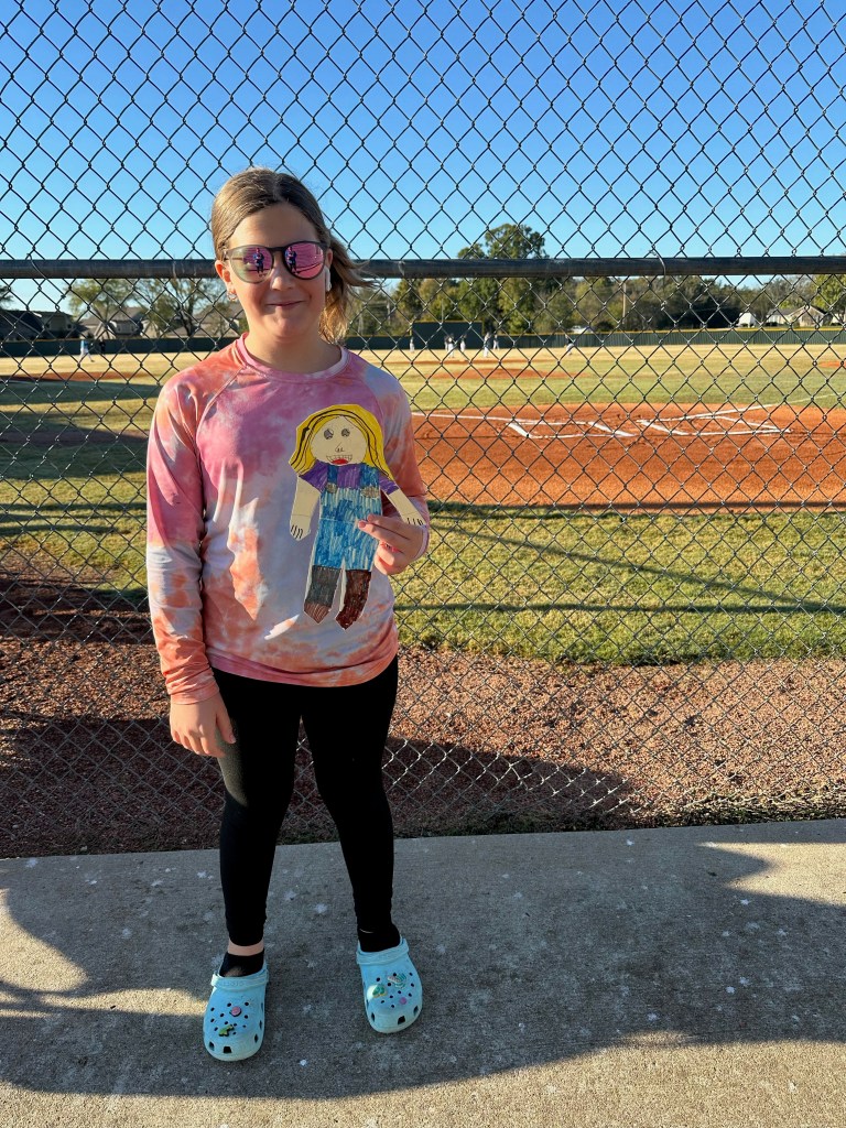 My name is Stephanie Thorpe and Miss Lila Devereux sent her Flat Lila to my family in TN. We have had her since Saturday and are having fun taking her around town! I am attaching a few pics of her first couple of days spent with us at the local ball park watching my oldest, Ryker play a game, then hung out with my younger kiddos, Ariya and Toryn. We will take her around to a couple more places around town and then send her on to her next destination!