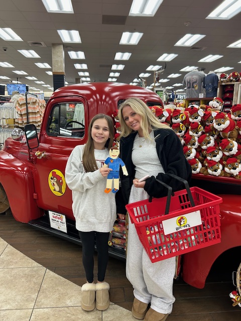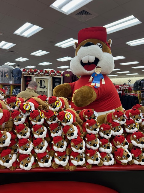 Flat Riley had so much fun with us in Georgia! While he was with us he actually traveled with Felicity’s Worlds Cheer Team to Majors in Indianapolis, IN. On our way we stopped in Lexington, KY to pick up Felicity’s big sister from the University of Kentucky. We ate at restaurant right near campus that had this fun giant Christmas Bear up for the holidays. We made our favorite pit stop at Buc-ees and had the best time cheer on Felicity’s team Steel of Stingrays Marietta.
