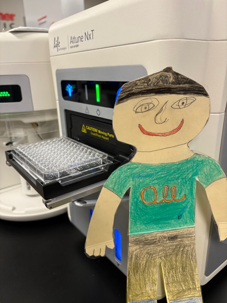 Flat Henry came to work with me on day and assisted me on a test of a lab instrument called a flow cytometer. He assisted with our test plate and held a culture tube for me as well.