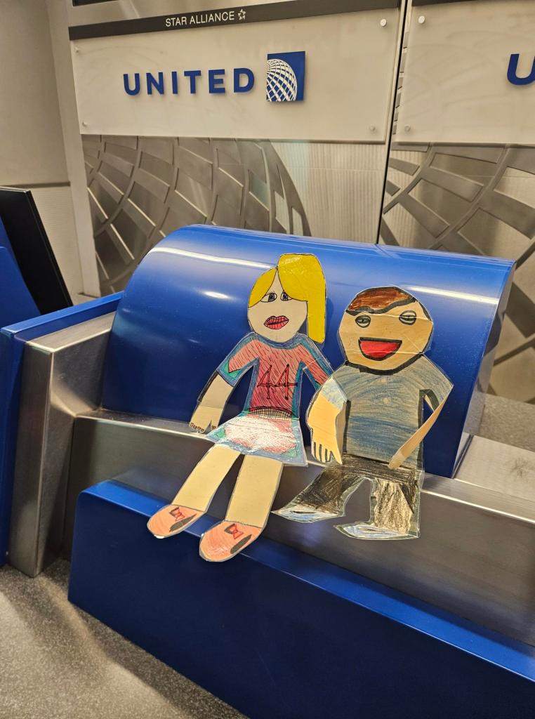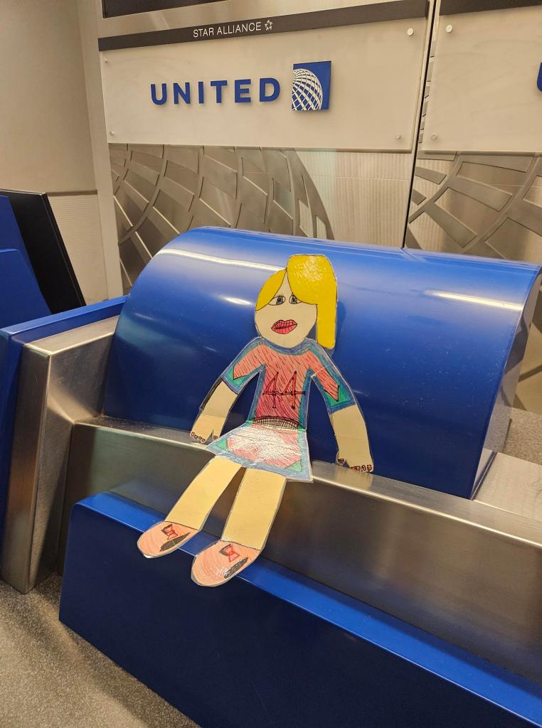 Hi everyone! Flat Macie and I are travelling together on a GRAND adventure. Here we are at the United Airlines counter in Houston, Texas. This is not our final stop. Our next flight is 10 hours long. We will send more photos soon. Can you guess where we are headed?